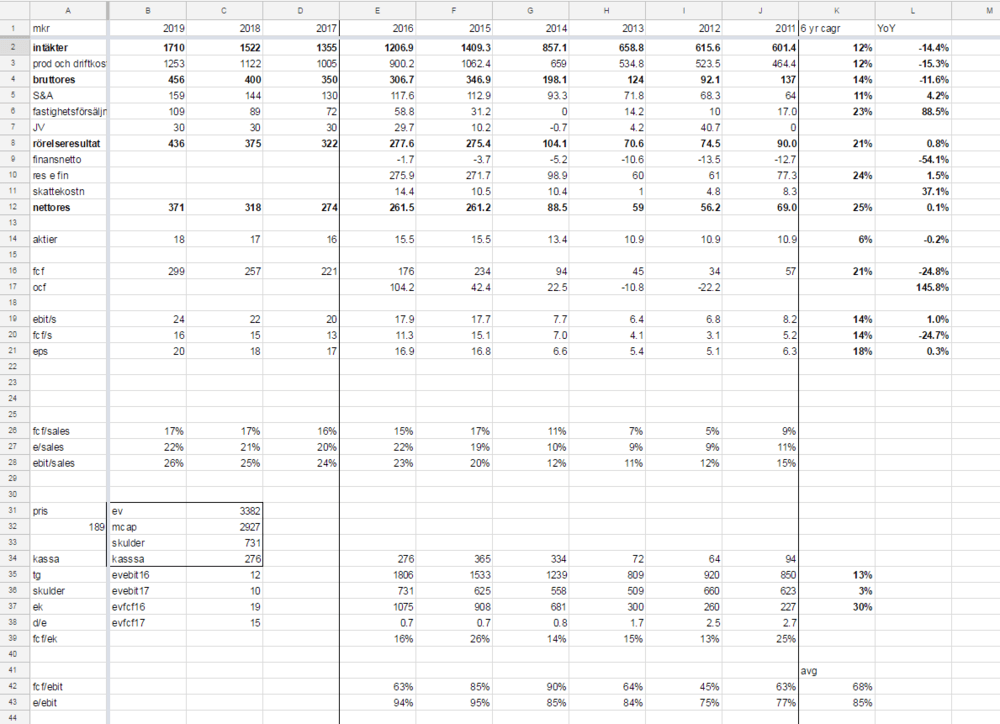 Det ger (EV/EBIT)/(EBIT per aktie cagr) = 0.9 och (EV/FCF)/(FCF per aktie cagr) = 1.4. Tar man därtill D/E 0.7 och ser till att de generarar 16% fcf/ek tycker jag Besqab ser ut att ha accepterbar risk/reward. Trots en del frågetecken inom bygg-/bostadssektorn tycker jag om Besqabs fokus på Stockholm. Ägarboken ser fördelaktig ut, och bolaget har en tillsynes sund balansräkning. Jag tycker bolaget ser attraktivt värderat ut, och jag tar in en första post under dagen.